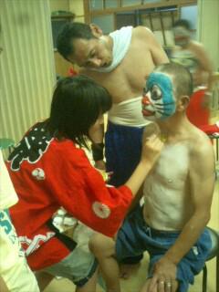 獅子舞が終わりフト横を見ると赤いハッピの三女がヘソ踊りのオジサンをドラえもんに変身させていました〜!