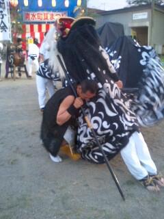 バックに清水町夏祭りの看板と黒獅子会の旗が見える