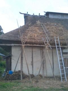 こ゛心配ご無用 (茅屋根に登るのは危ないからヨセー太郎)