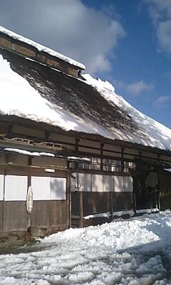 かや屋根と雪との間に雨水が入り