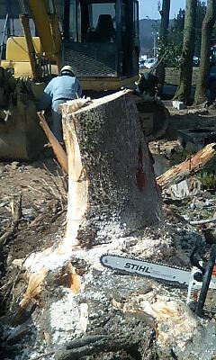 さっそくチェーンソーで根元を爆音轟かせカットいたしました。