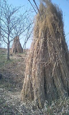 茅場に立てかけて一冬越した茅を運びました。