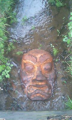 小川に浮かんだ怖い顔がじっとこっちを睨んでいます。