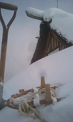 茅葺き屋根の雪下ろしは下から上に登る・・