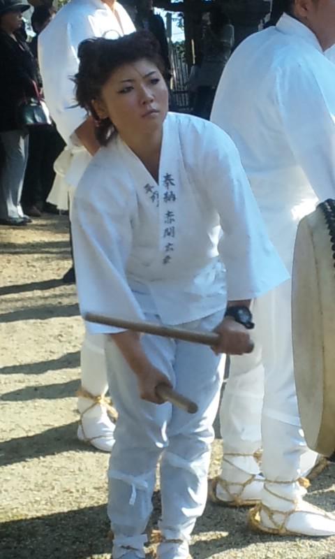 年若き麗しき女性の太鼓ぶちが、古式に則った神社の例祭に