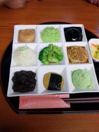 左真ん中から、からみ(大根おろし)、箸休めのブロッコリー、納豆