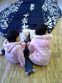 女の子は獅子の白い髪に興味深々。 ナデナデしてます♪