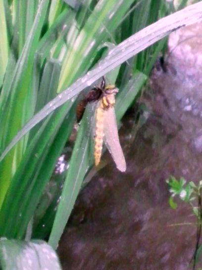 側の小川の様子を見に行くと、オニヤンマの羽化を目撃しました!