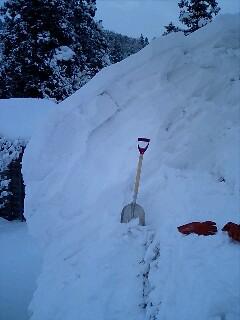 東側の屋根の角に2Mも雪が積もっていました。圧縮されて他の部分より相当重く雪を落とすと足元でミシッっと音がしてびくっとします。梁がいくぶん軽くなってしなりが戻って音をたてているのでしょうか。暗くなってきてどこからか「止めろはー」と言う声が聞こえたので屋根から下りました。