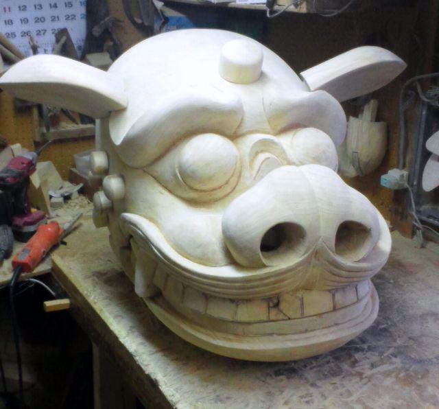 今日は頭の側面の丸いコブを取り付け、頭と下アゴの連結軸を加工しました