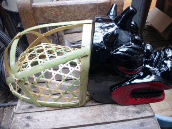 これから獅子頭の金を塗り、羽根の蓑を作り顔を隠す幕を取り付けます