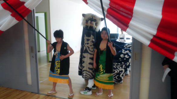 笛と太鼓が後に続き、小粒な獅子が飛び出しました