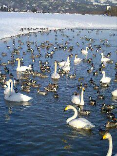 飯豊町に白鳥を見に行きました。数え切れない白鳥や鴨が快晴の青空の下で気持ち良さそうに泳いでいます。今年のように豪雪では白鳥達は餌を探すことができるのでしょうか?我が家の朝食のパンを差し入れました。