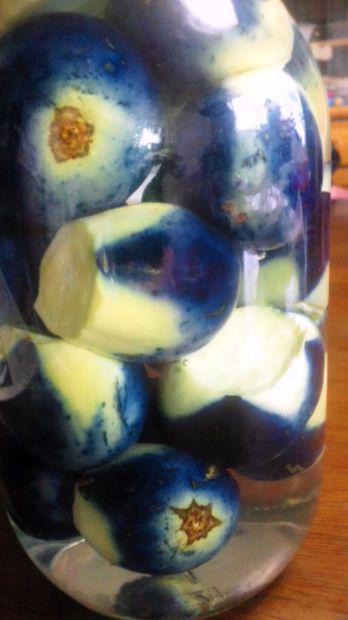 薄皮丸なすが深い青色に漬かりました
