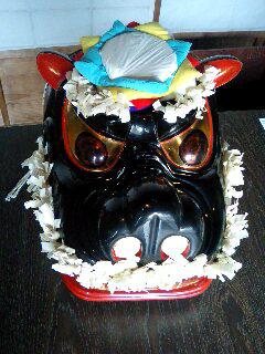 とある庄内のお獅子が獅子宿にいらっしゃいました。獅子の色は黒くヒゲが紙で作られ毎年更新するそうです。宮内のお獅子と良く似て同じようにヒゲの穴が有り、額に鏡が埋め込まれています。庄内のお獅子はなんと!額に鏡が紐で取り付けられております。紙でくるまれた直結七・八センチ厚み二センチほどの鏡でした。どちらも熊野神社ということもあり庄内と置賜に、いにしえの文化交流があったことが伺えます。