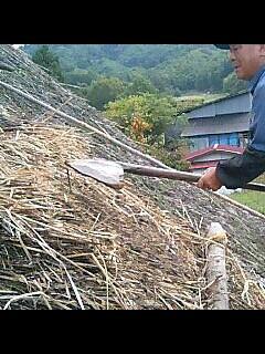茅葺き工事もだいぶ進みました。古い茅に新しい茅をサンドしてして厚くしているようです。今その茅を押して均しているような作業です。