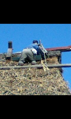 獅子宿の茅屋根のてっぺんに枕木のバッテンが並んでいて「蔵がけ」といいます。杉皮で葺いた屋根の部分の押さえなんですが、だいぶ老朽化して穴が開く恐れがあるのでトタン板で補強しました。上に登って見下ろすと棟木も中が朽ちてました。抜け落ちる恐れもあり来年度は大工工事が必要ですね。