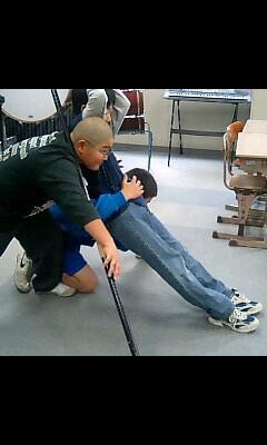 先週朝会発表で獅子舞クラブの発表を行いました。本番前の警護かかりの稽古です。警護役の子が頭を見事にクリクリにして気合いを入れてきてくれました。