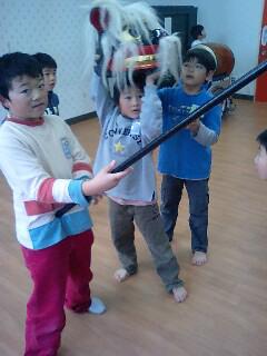 一年生の彼は初めてお獅子を持ってバコンしました。本人は何のことやらわからない様子です。こども芸術祭に参加するため頑張ってます。みんなも心配そうに見守ってます。