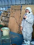 白いドラエモンのような奴は娘の課題制作姿。ワタクシに似てカッコイイイとはいえない作業姿です。粘土で塑像制作した人体像を石膏で型を作りFRP強化プラスチックで成型します。大学から石膏型を獅子宿のビニールハウスに運んで制作します。初めて扱うポリエステェル樹脂とガラス繊維の扱い方を伝授しています。私の飯豊牛の制作も始めました。やはりFRPで制作します。今日はまさに春の日差しが暑いほどビニールハウスに注ぎました。日焼けしたかな?