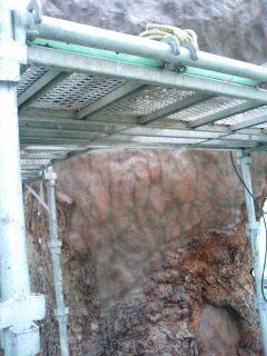 本日は獅子宿定休日ですが、影のお仕事?・・樹木の化粧師です。今日は有名な東根の大ケヤキです。業者が太い枝を吊っていたワイヤーをうっかり緩めたら折れてしまったという悲惨な部分。その補修穴埋めした所を化粧するという仕事です。以前も手掛け、うっかり足場を踏み外して痛い思いをした事があります。高所での作業は余裕をもって行わないと怪我をしますね。この大きな枝折れはこの大ケヤキにとって腕を切られるようなダメージがあったように思われます。大ケヤキが一回りも二回りも縮んだような印象です。