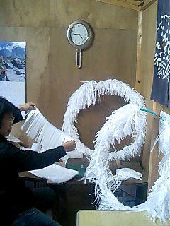 獅子踊りのクライマックスで使う火の輪を作ってます。本来は竹で三つ輪を作ってエルビスプレスリーの袖みたいな和紙を作って巻いていきます。赤く塗った三つの輪を上下二カ所で結んでスライドするようにします。イザ!獅子がその火の輪を飛び抜け拍手喝采と言うわけです!いや〜和紙を切って巻くのが手前なんです!作り方なんて有りませんから保存会の火の輪を借りて探りました。