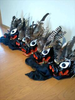 羽根の修理の為に小学校からお借りしてきました。並べて見ると壮観です!つぶらな目で圧倒されます。これらは皆先生方の手作りらしい獅子頭です。