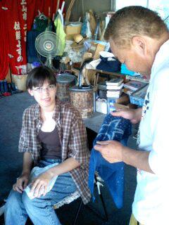 アメリカの大学の授業で制作した絞りの藍染めのハンカチです。ダイアナさんは長井市で発行してる市報にイラストを連載しているだけあってデザインは流石にお手の物ですね〜。