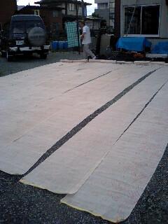 広い居間に敷く絨毯ではありません。麻の獅子幕を制作しています。模様を写し取り糊おきを行う前に打ち合わせをおこないました。
