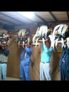 獅子を車に乗せて神社に向かいました。獅子連の幹部が神社でそのまま境内の中においでと手招きしていました。鳥居に入り神社の前に停車し拝殿の中に運び入れ、ついに新旧獅子が実家に勢揃いしました。