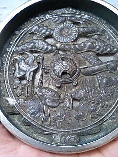 庄内の獅子頭の額にあった鏡と比較して鮮明な模様でした。実はもう一つ落札できたので送られてくるはずで楽しみに待っている次第であります。鏡の中央に、背中に穴の開いた亀がいます。その穴に紐を通し獅子頭の額の二つの穴に通して固定します。鏡は和紙に包まれ二重の座布団も敷かれ神妙に固定されていました。神主さんもその鏡の裏の模様には気付かずびっくりしておられましたので貴重な資料の発見になるかもしれません!しかし二羽の鶴がくちばしをくっつけてチューをしているところに何故か亀が横からチューに参加しているデザインとはいったいどんな意味合いがあるのでしょうか?下の鶴の後ろには数羽の子供の鶴を引連れております。ということは、つがいの鶴ということでしょうか?背景には鶴亀に付ものの松竹梅が描かれてめでたさを引き立たせているようです。謎は深まります。