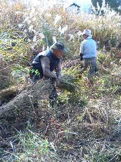 弱々しい日差しでも汗ばむような晴天でした。毎年この場所を借り、来年の屋根の補修に使う茅刈りをしています。この時期を逸すると雪が降り茅が皆倒れて刈れなくなってしまいます。刈った茅はその場所にまとめられ寒風に晒し雪解けの春まで保管されます。明日は雨の予報で今日は大事な晩秋の貴重な晴天でした。