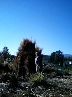 おととい、澄み切った晩秋の空の下で茅刈りをしました。あさって天気が荒れて平地でも雪という天気予報が出たからです。寝る前に天気予報が外れる事を祈りましたが朝起きて窓を見るとやはり景色は真っ白でした。すぐ消えるかと思ったらなかなか消えず本日より真冬に突入です。昨日は二台のタイヤ交換をいたしましたが、きゅーんきゅーんとエアーの工具を駆使してF1のタイヤ交換のような手際でしたよ。