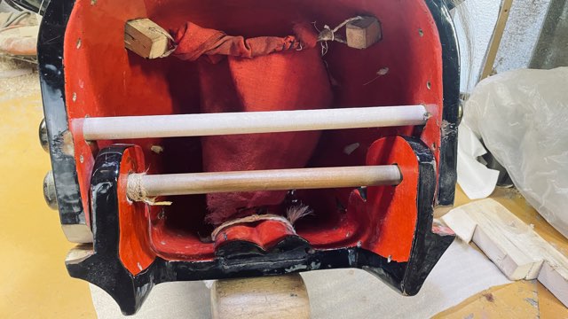 この獅子頭が破損したと夜に連絡が入った。二本の軸棒の上の棒が