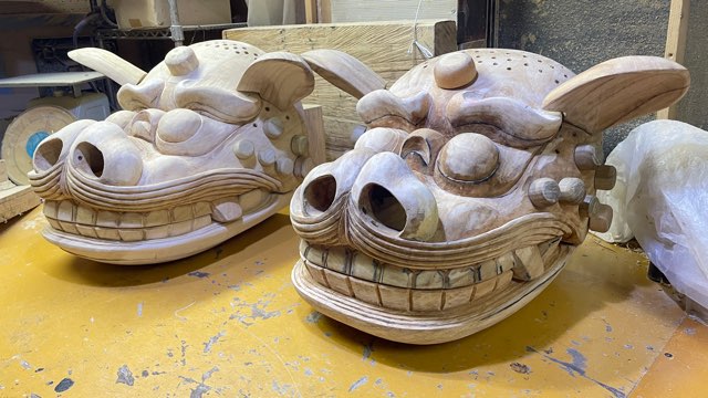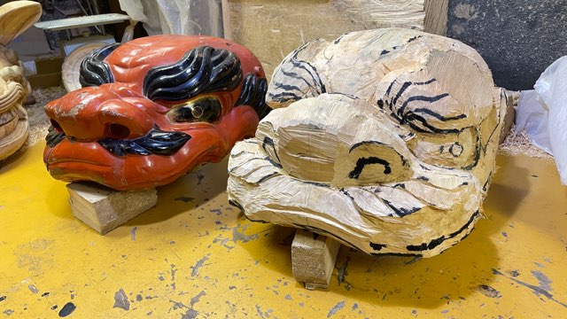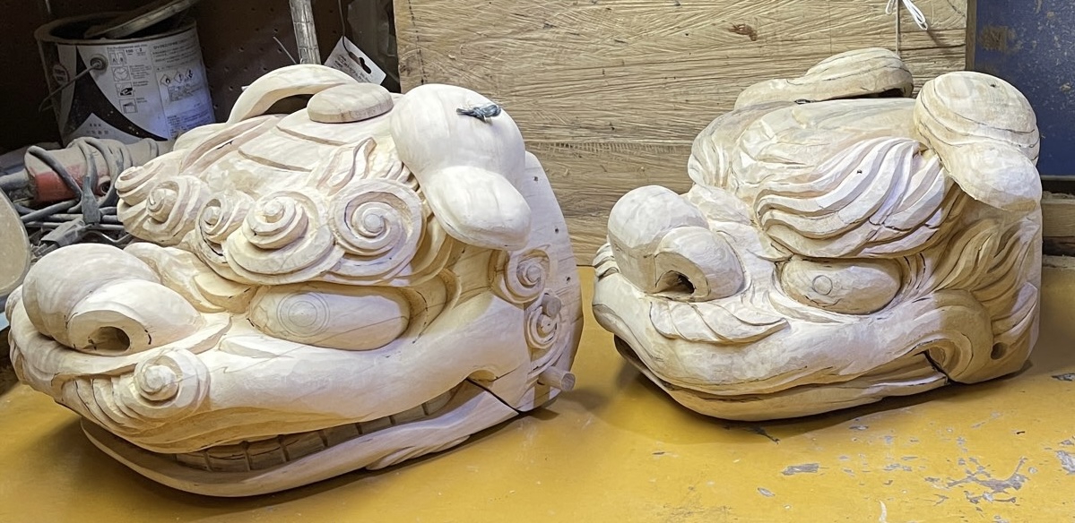 重量級の成田五十川型の獅子木地3頭、蛇頭型2頭、龍頭2、それぞれの顎の部材を木取りしたものを用意し