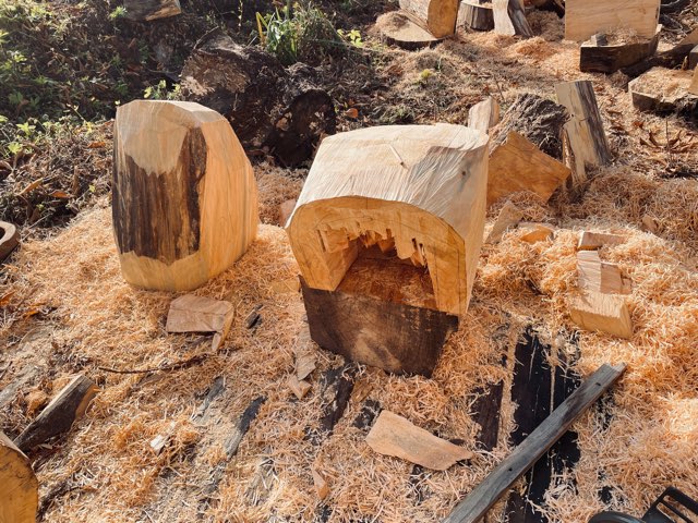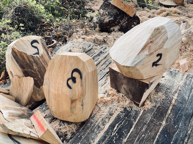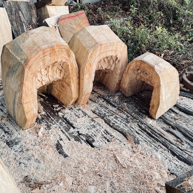 仕事。その木塊から外側のフォルムを形どり、内部を削り軽くしてから本格的な彫刻のスタートとなる。それを