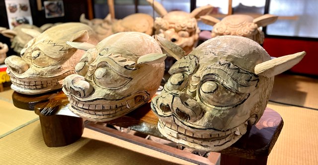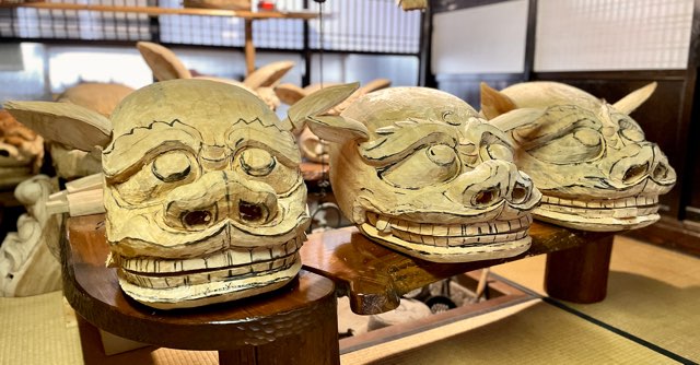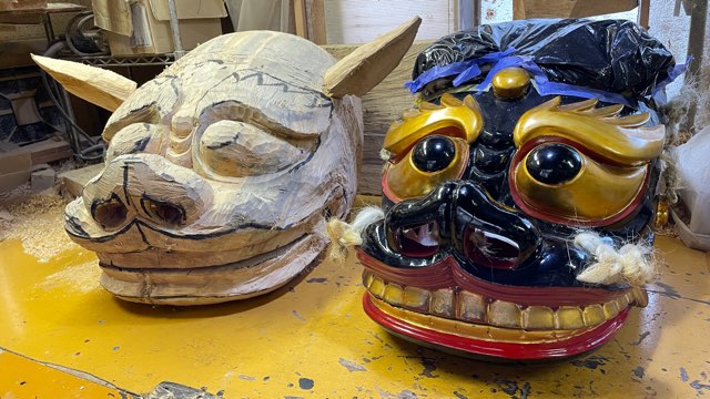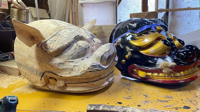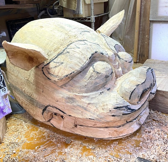 昨年11月から成田五十川型の獅子頭の制作を進め2月13日から三頭目の荒彫り