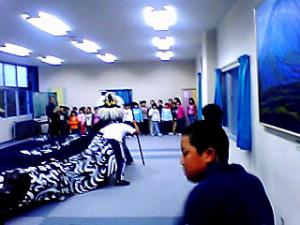 本日の長井小学校獅子舞クラブは昨日の獅子舞のビデオ鑑賞でした。幕の中で顔が見えませんが一生懸命な演技は会場の大人たちに伝わったようでした。逆に、お客さんの反応は中にいてもすごく感じて、これがやみつきになる原因の一つなんです。見学の三年生が次々とやってきて、そのたびにビデオを中断して獅子舞を披露します。警護掛かりもやってだんだん悪乗りしてひっくり返ったり大騒ぎでした。