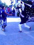 勧進代の太鼓のバチは他の神社と違って桐材なんですね。大抵、ほうの木で作られているんですが。ほうの木よりずっと軽く、やや太めで若干短い撥なんです。最初は、それがなんとも叩きずらい!川西や今泉、豊田ではちょっと長めのバチを使ってスナップを効かせて叩きますが、そのつもりで叩くと戸惑います。勧進代の方々は手首を柔らかく、腕の振りを利かせ打つんです。バチが太鼓にあたる瞬間に力を入れないと音が出ないんです。こちらの笛太鼓は鳴り物といって、他と違って節々にピッピッと音を高く鳴らす独特の笛で、かなり高度な技術、年季を要する吹き方のようです。