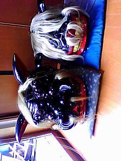 今制作の依頼を受けて、お預かりしている大きく他に類を見ないお獅子を御紹介いたします。右のお獅子が一般的な大きさですから、その巨大さがお解かりかと思います。いやぁー、ちゃんと横にしてお見せしたいですね。読者の皆さんは首を左に傾けてご覧いただいておるでしょうね。右に傾けたり左に傾けたり、丁度肩こりの運動になりますね。ははは このお獅子を彫るには、生活を一緒にして、家族同様に馴染まないと彫れないなぁーなんて思っています。一緒にお酒を飲んで、齢百歳のお獅子の話を肴にして秋の気配を楽しんでおりますぞ。
