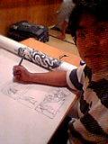 またご馳走になってしまいました。ママさんすみませんねぇ。飲み屋さんに一人で飲みに行くのは、なんと!初めてでありました。そう初体験なんです。知ってる人はママさんだけなので、忙しく注文をこなしているママさんとはなかなか話も出来ず黙々と生ビールを飲んでおりましたが、テーブルの席が空いたので下絵を広げて制作を始めました。絵を描く現場でその場所の面積や雰囲気を考えながら構図を探っていきます。色んなパターンの構図が浮かんできます。生ビールも美味しくて、ゲソ天をお願いしたら親指ぐらいの太いゲソにびっくり!にゃんこのような食べ方でたいらげてしまいました。ウマカッタァ。前回いただいた竜田揚げも美味しかったなぁ。なんかすごーくいい気分で下絵の制作ができました。でもまぁーだ完成してないんです。またお邪魔して今度はちゃんとお代も払って飲みたいなぁ。ママさんごちそうさまでーした。
