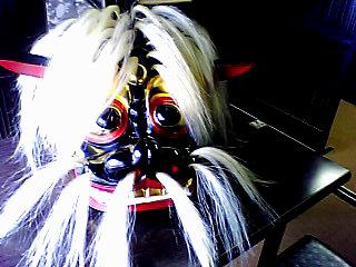 漆の工程が終了しました。漆が塗られ白い毛が植えられて木地の獅子の時よりひとまわりでっかく成長して戻ってきました。奥行き75cmもあるので本当に大きく見えます。見上げる様な赤い縁取りが効いたつぶらな瞳、豊かな頭髪や頬髭。耳がつーーんと尖って緊張感がありますね。頭髪で見えにくいけどギザギザ木葉の眉毛が独特です。ここの地区の神社の振り方は、あの獅子のなんとも愛くるしい表情からは想像できない勇壮な振り方です。さーて!できたての獅子頭は注意して触りましうね!漆は湿気と反応して硬化してますが、漆に過敏に反応する体質の方は、たまにちょっと触っただけでも漆まけを起こすからです。触ってから五分も経たないうちにぼつぼつ水泡が出てくることもありますので注意しましょうね。私は新しい獅子を持つたび漆負け反応が表れ、大変です。これに懲りて次回は手袋でも用意すればいいものを、忘れてまた見事に漆負けてしまいます。負けず嫌いの自分は、なんとか勝つ方法は無い物か頭をひねっています。