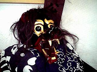 数年前、長井高校の庭の柳が風折れしたものをいただき制作しました。黒いので見えにくいのですが、木地の時は「豚ですか?猪ですか?」と失礼なご意見もあったんです。黒い馬の毛を植えて見ましたが、やはり黒い獅子の色には白の毛がいいようです。野性味はありますね。柳で薄く作っていますので軽く、獅子頭というより面というカテゴリーの分野に属したほうがいいかな。軸を噛んで固定もできます。以前から新しい創作の舞の構想があり、その手始めに作ってみました。熊に見えるかな?熊の動きを研究して舞いにしてみたいですね。