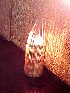 簡単でしたか?一見してモダン和風な照明器具ですが、魚を捕まえるための漁具です。ただし名前がわかりません。ホームセンターの玄関にどーだい!とばかりに10コぐらい並べておりました。あっこれは!とすぐに購入し電球とソケット、コード、コンセントをくっつけ照明器具に致しました。獅子宿のトイレに行く途中の暗い廊下に設置していますのでご覧くださいませ。下の入り口から魚が侵入予定で、上の部分の竹がつぼまっている所が出口。針金の輪ッかがストッパーになってます。それを取ると魚がべローンと出てくるという仕掛けです。ホームセンターもやるもんですなー。あんな伝統的な漁具を仕入れて売れる物かどうか?しかも、さり気なく何の説明も無く販売するとはさすが「ムサシ」さん。消費者の市場調査はバッチリやっているはず。ムサシの名前も気に入ってよく利用しておりますよ。一般的にホームセンターの特徴として男の店員さんの愛想が悪いですね。年配の方ほどその傾向があって嫌な気分になる時が多いので近寄りません。