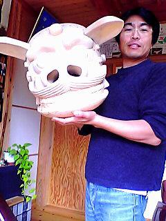 おーーっ!獅子が光っております。まっさらなお獅子はまだ何にも染まらずに無垢であります。しかーーし、ちーゃんと獅子の表情には先代の獅子の遺伝子を受け継ぐかのような面影を授けました。重さは六キロ。仕上がりはプラス500グラムぐらいでしょうか。正月までに完成の予定です。木地の仕上がりはかなり前でしたが動くかどうか観察しておりました。鼻先から前歯の割れ防止も二重構造の工夫を施し、五所のあの激しい歯打ちにも耐えられるように作っています。獅子の奥行きは短く頭が高く作られ、頭に載せるよりかかげる振り方の獅子になっています。先代のモデルになった獅子の底が平になっているのは、ほとんど頭に載せない獅子だからなんでしょうね。