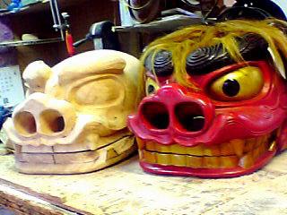 きてます。素材は柳。なるべく軽くという依頼ですがなかなか軽量化しにくい形で、デザインを忠実に再現すれば重くなってしまうんです。例えば眉毛。中を空洞化したりは名の穴を彫り込んだりすればだいぶ違います。今、八キロあったかな。見えませんが耳も厚く軸や取っ手も金属で重くなっています。