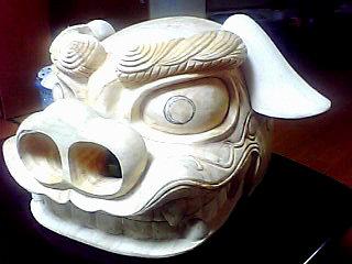 細部の彫りに入っています。でも、持ってみますと重いです。7キロ以上あるかな。もともと10キロあるから充分軽くなったはず。前の方も軽くバランスよくしたいので、だいぶ鼻の中も削りました。耳も片方で300グラムあるのでもっと軽くできますね。今日は顎の軸と握る棒を作ります。先代の目玉がガラスをはめ込まれていて、以前ひびが入って修理の際、眼鏡屋さんから譲ってもらった新しいガラスが入っています。コンタクト入れていると言う感じですかな。新しいお獅子はまだ近眼の心配はなさそうなんで肉眼で大丈夫だね!