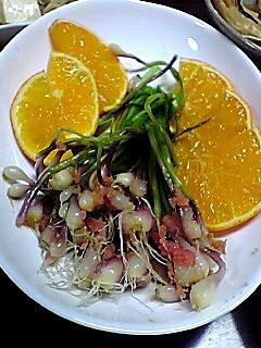 タラコを球根にまぶしてみました。生で味噌をつけてチマチマ食べるのもいいんですがね。子供たちはオレンジだけ食べました。少し熱湯に通し辛味を押さえましたが、まだ辛いらしいんです。