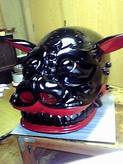 視線が天に向かっています。天にいる何かを気にしているのでしょうか。それとも顎を引いて睨みつけようとする表情をヨシとしているのでしょうか。なんとも不思議な表情です。金箔と目の縁に赤が入るとガラッと表情が引き締まります。今週の土日に例大祭でお披露目になります。