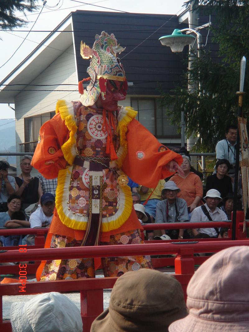 舞楽を拝見して俗物の私には高尚すぎて楽しめません。囃子の音に誘われて戻ってみるとトラックを屋台にして飾りつけた囃子の屋台が移動中でした。子供が晴れ着を着て笛や太鼓を演奏しています。華やかです。まさに晴れの日。私が外国人であったら狂気乱舞しているような日本の伝統文化の香りがプンプンと漂ってくるようです。
